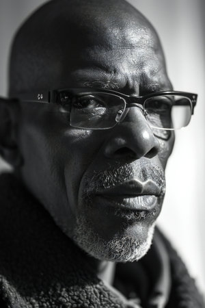 Portrait of a senior African man wearing glasses. Black and white.
