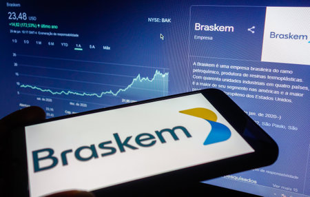 Braskem SA logo visible on smartphone screen, and website page showing stock chart of the stock in the background