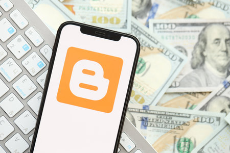 KYIV, UKRAINE - APRIL 1, 2024 Blogger icon on smartphone screen on many usd money bills. iPhone display with app logo and dollar banknotes with white keyboard
