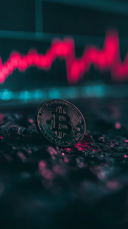 Bitcoin cryptocurrency coin standing on dark ground with illuminated stock market graph showing loss in red in the background representing the volatility of cryptocurrency investment