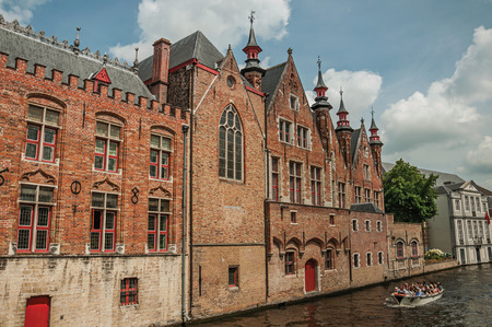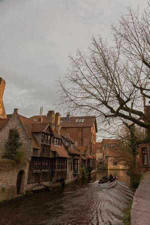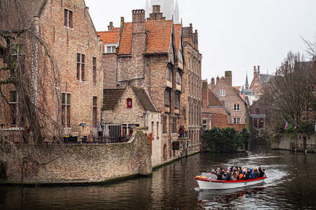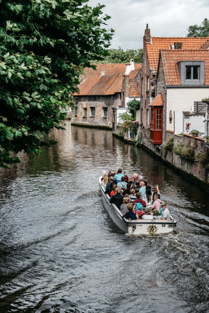 Boat tour on historic Spiegelrei canal in old town of Bruges, Belgium