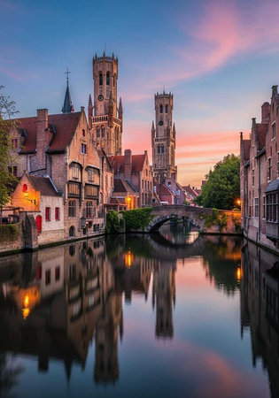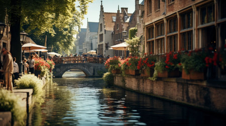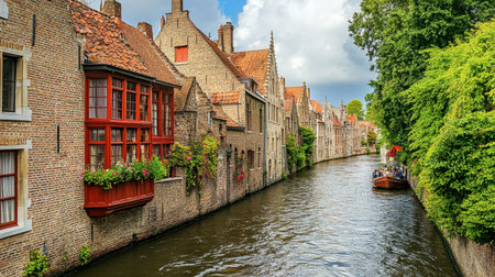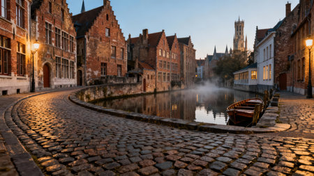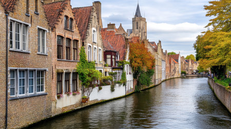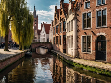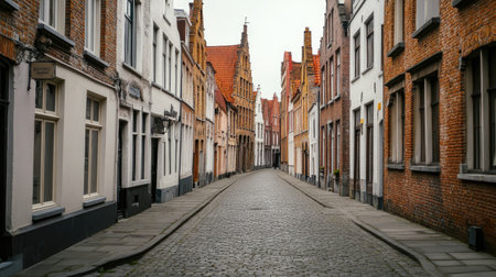 The charming streets of Bruges, Belgium, lined with historic brick houses and canals, creating a fairy-tale atmosphere.