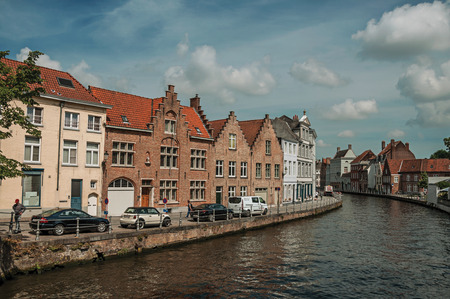 Bruges, Belgium - July 05, 2017. Sidewalk and brick buildings on the canal in Bruges. With many canals and old buildings, this graceful town is a World Heritage Site of Unesco. Northwestern Belgium.