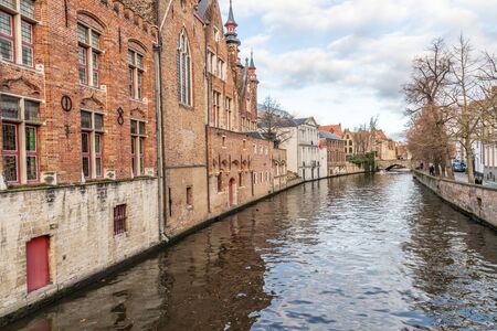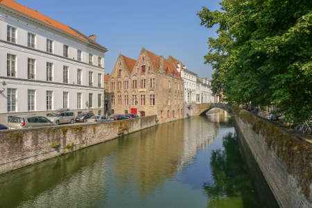 Houses and canal in Bruges, Belgium. The Reien or canals of Bruges are the remains of the river Reie that used to run through the city.