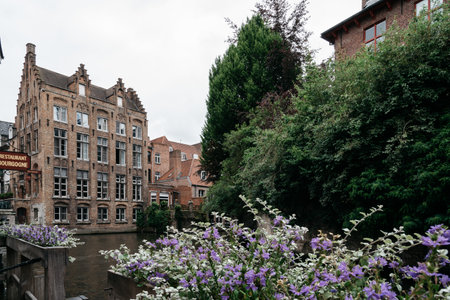 Bruges, flanders belgium. August 2019. Approaching the historic center, the medieval aspect emerges: cobbled streets, low red brick houses.