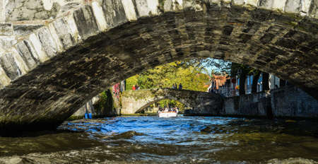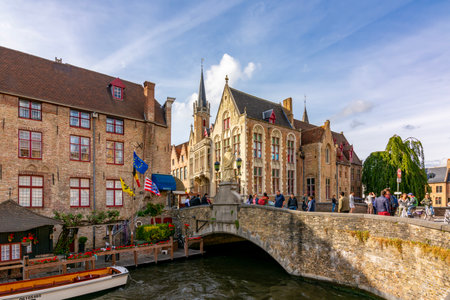 Bruges, Belgium - Oct 5, 2018. Stone ancient bridge with the canal in sunny day. Bruges is a medieval fairy-tale town and Belgium most visited city with 7.8 million people every year.
