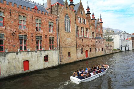 Bruges, Belgium, April 16, 2015. Tourists on a canal boat tour
