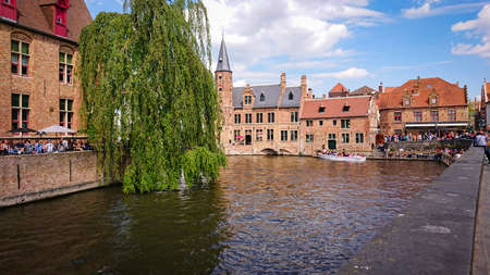 Bruges, flanders belgium.August 2019.Rozenhoedkaai is a landmark of the historic center, the most loved by tourists: the canal that curves around the house with the willow and the bell tower.