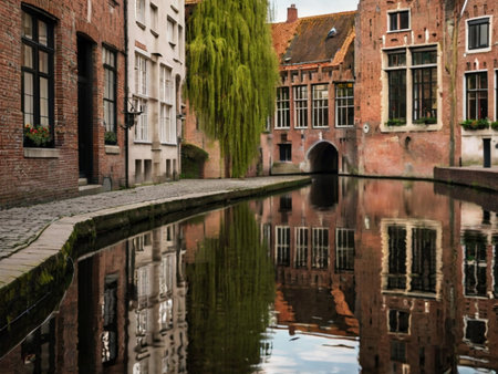 Idyllic canal reflections in medieval city of Bruges, Belgium