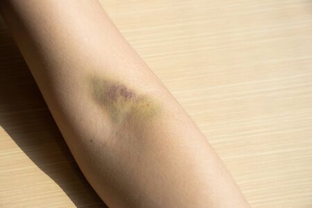 Accidents and wounds caused by impact. Purple skin bruises and abrasions.