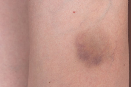 Close-up of a human leg with a large dark purple bruise on smooth brown skin under soft lighting.