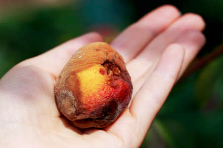 the rotten peach in a man hand