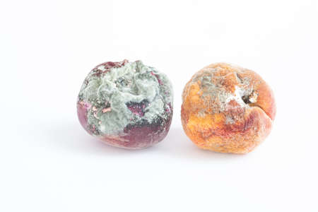 ingle rotten nectarine with white fungus on skin isolated on white background. Selective focus.