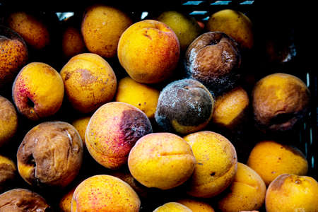 A background of discarded rotten fruits left to waste after the market. Apricots.