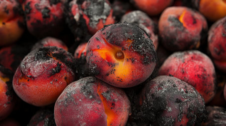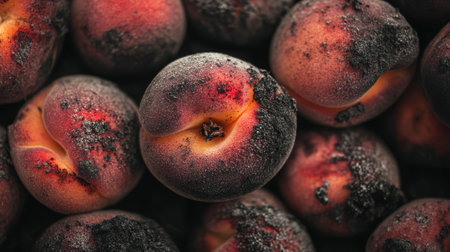 Close up view of several peaches coated in dark gray powder or ash, creating a moody and textured image. The peaches are in focus, with the background slightly blurred. The overall color palette is dark and somber, with shades of red, orange, and gray dominating.