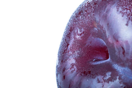 Closeup of part of fresh juicy ripe purple plum on white background