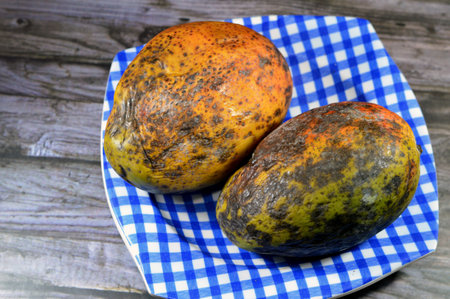 Mango fruit with mold, mould is one of the structures that certain fungi can form, formation of spores containing fungal secondary metabolites, decaying lemon, dry, discolored, disambiguation