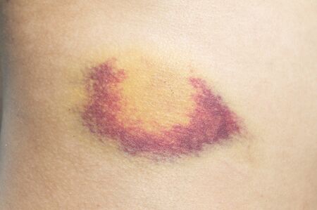Large painful hematoma and trauma on the female torso. Bruise on the female stomach.