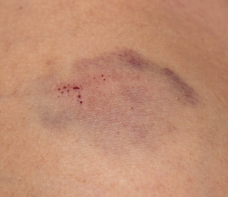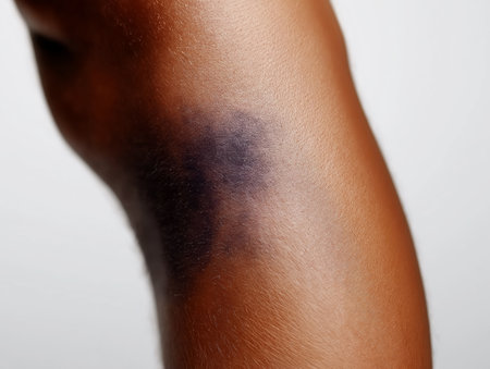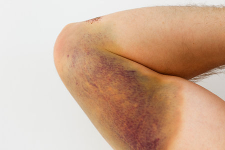 A close up view of a bruised elbow reveals discoloration and swelling from recent impact showcasing the bodys healing process.