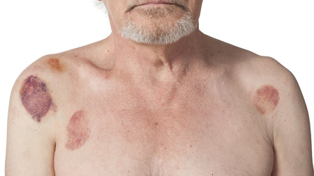 Mark and ecchymosis after blood collection, Person tearing off the patch with a dressing from the needle injection site by a nurse,