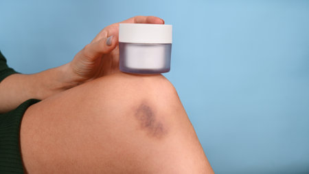 A large number of bruises on legs, skin in need of care and recovery. Woman applying cream to bruises for healing.