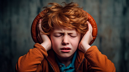 a young boy with headphones on and a concerned look on his face