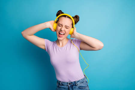 Photo of cheerful youngster lady two buns good mood listen modern technology earphones excited party eyes closed scream song wear casual purple t-shirt isolated blue color background