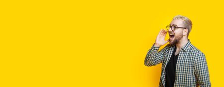 Blonde caucasian man with beard and eyeglasses is screaming on a yellow background with free space