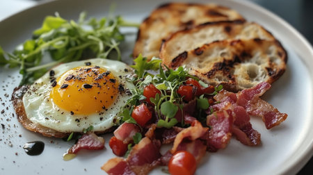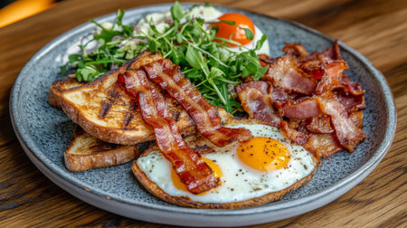 A mouthwatering breakfast platter showcasing fried eggs, crispy bacon, toasted bread, and fresh greens. Perfect for brunch lovers seeking flavor and nutrition.
