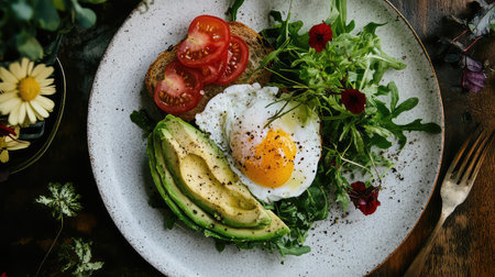 A visually appealing breakfast plate featuring a perfectly poached egg, sliced tomatoes, creamy avocado, and fresh greens, showcasing a healthy start to the day.