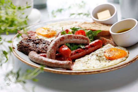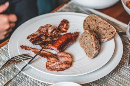 Close up of sausage and bacon in homade brunch with food in unique porcelaine plate