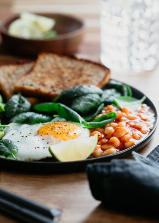 Healthy breakfast or lunch at home or cafe with fried egg, avocado, toasts, beans and fresh spinach on a wooden table.