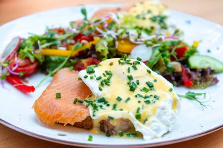 Two delicious poached eggs with salmon on toast served with mixed vegetables and lettuce in white ceramic plate