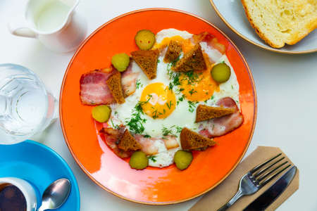 Russian cuisine - scrambled eggs with bacon, croutons and pickled