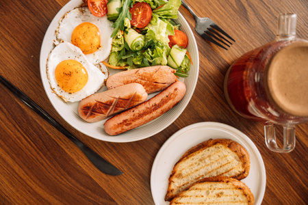 Smoked bratwurst sausage, and fried eggs on plate, hearty international breakfast dish.