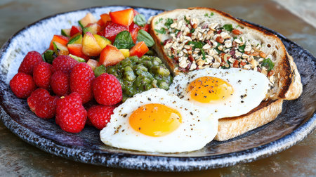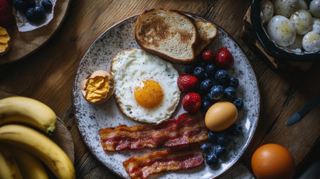 A delightful breakfast plate featuring fried eggs, crispy bacon, toast, and a variety of fresh fruits, including strawberries, blueberries, and oranges. Perfect for morning energy!