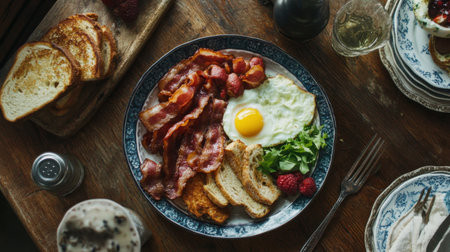 Enjoy a beautifully arranged breakfast plate featuring crispy bacon, a sunny-side-up egg, toast, fresh greens, and raspberries, perfect for a cozy morning meal.