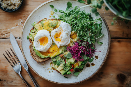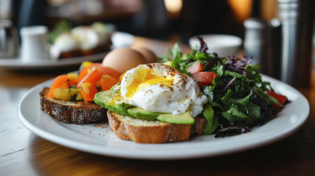 A gourmet brunch setup featuring avocado toast, poached eggs, and a side of mixed greens, beautifully plated.