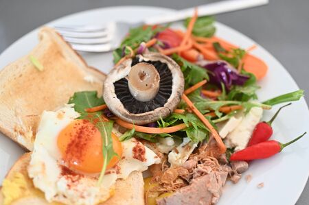 Fresh vegetarian meal made out of mushroom, slices of bread, egg, tuna, vegetables and hot Chili pepper served in a plate.