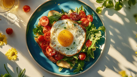 A beautifully arranged breakfast featuring a sunny side up egg on crispy toast, surrounded by fresh tomatoes and arugula, set against a vibrant background.