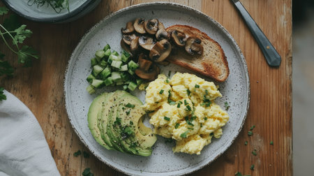 A vibrant breakfast plate featuring fluffy scrambled eggs, fresh avocado slices, saut