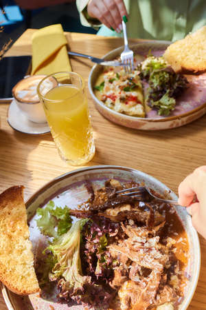 Friends group having english breakfast at cafe restaurant, close-up.