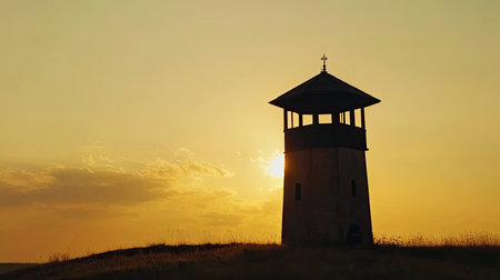 A striking silhouette of a tower standing against a vibrant sunset sky. The scene captures natural beauty and architectural simplicity, perfect for tranquil settings.