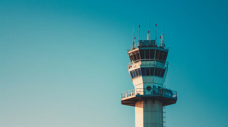 airport control tower, modern design against clear sky with copyspace