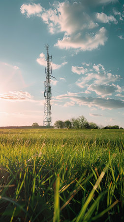 A 5G mobile internet communication tower transmits wireless signals under a bright sky, showcasing modern telecommunication technology.