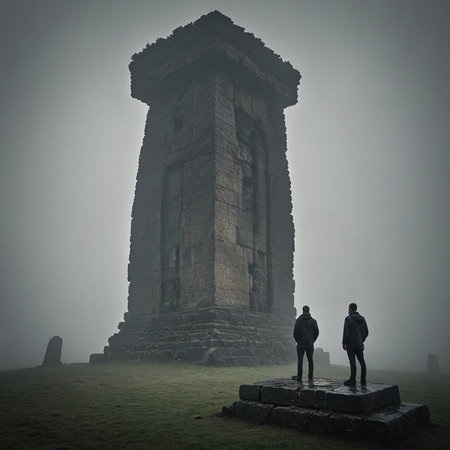 Mysterious Man Contemplating Ancient Stone Monument in Misty Ambiance