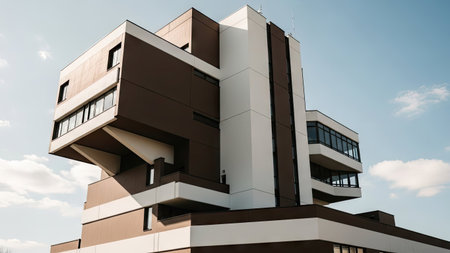 The modern architectural building or skyscraper with bright blue sky. Low angle view of tower central or office or work place. Abstract picture of city lifestyle or urban lifestyle concept. AIG42.