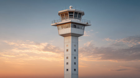 A striking air traffic control tower standing tall against a beautiful sunset sky, highlighting the importance of aviation and connectivity in modern travel.