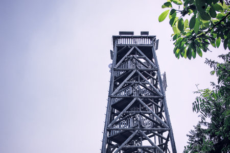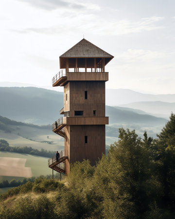 Big wooden lookout tower. Distant view. Beautiful place.