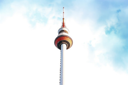 Low angle up view of broadcasting tower Fernsehturm TV Tower at Alexanderplatz. Berlin, Germany